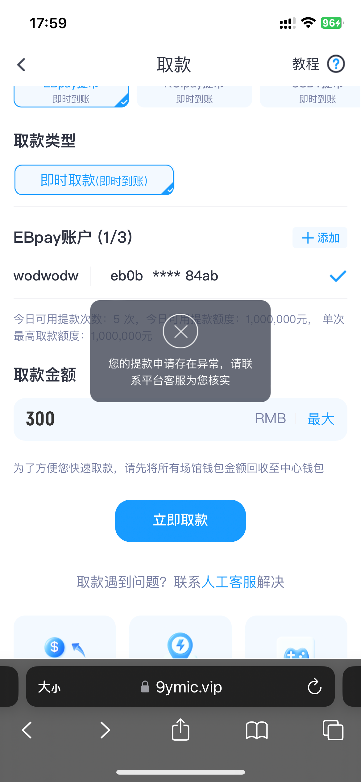 这1000算是废了 拉斯维加斯 签到8.8 打了400 然后冲了100 打到1000 说只能用k宝和mipay 取款 这两个钱包实名都被封了 草 咋搞