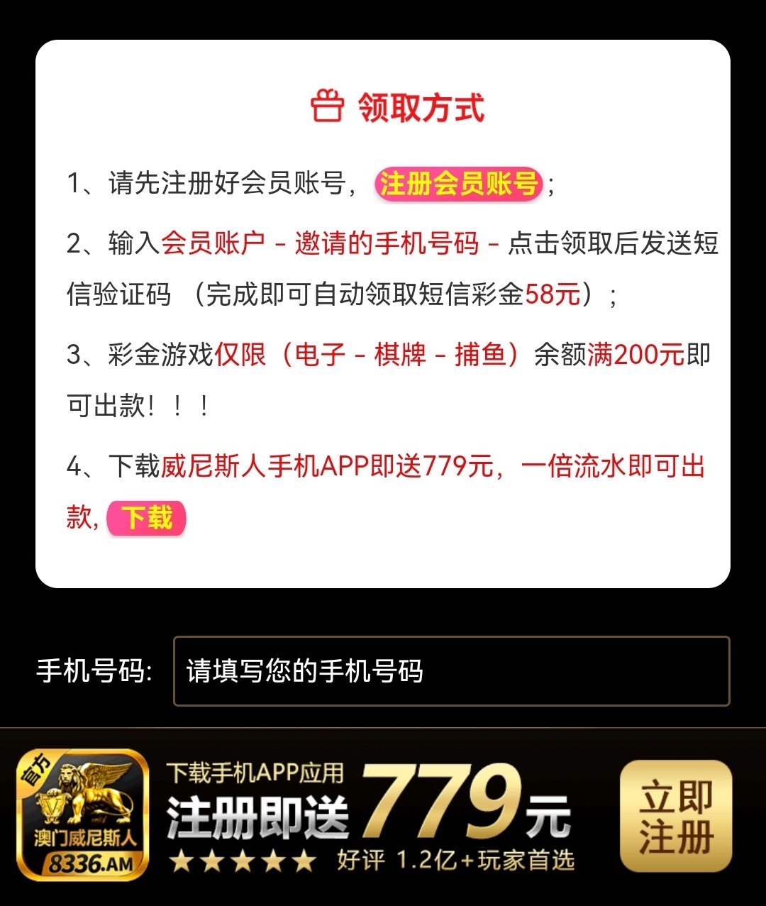 特邀碰瓷。新用户下载注册,链接里秒领58彩金,可以先去链接里的自助领取彩金,输入手机号获取验证码,看看能不能收到验证码,能收到说明可以领,之后再注册领取。收不到无视即可。