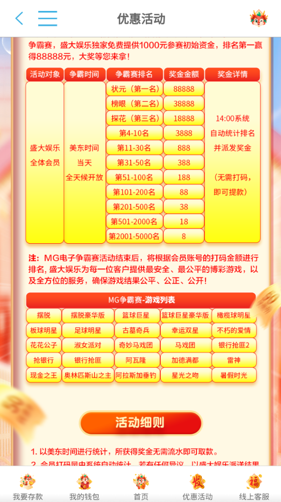 盛大最新MG争霸赛,前5000名就有8元,我直接空转到底都有8元,速度冲呀!新用户优惠活动里面下载单独的APP必送17,签到积分集卡等白嫖活动。
