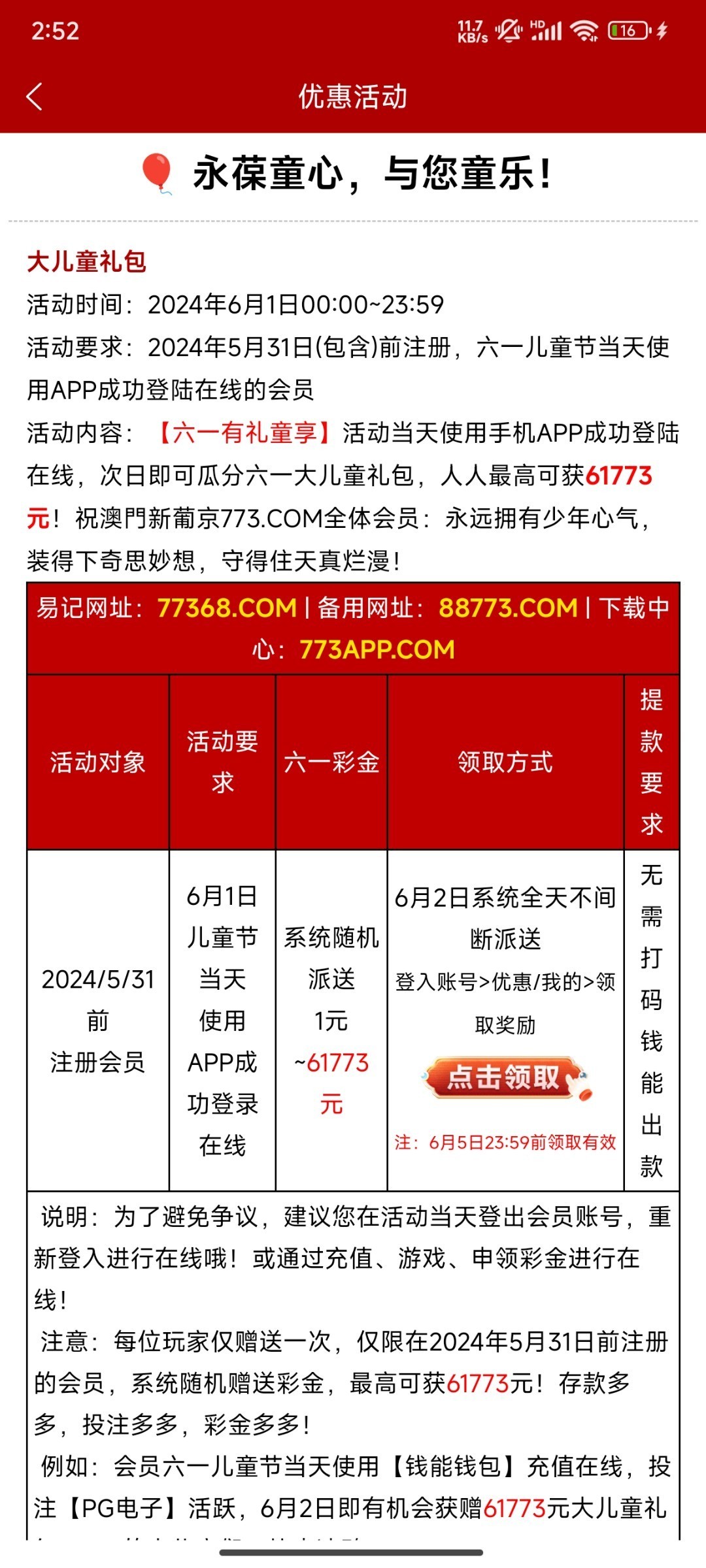 本站声明 1、本帖标题:新葡京773 六一儿童节红包