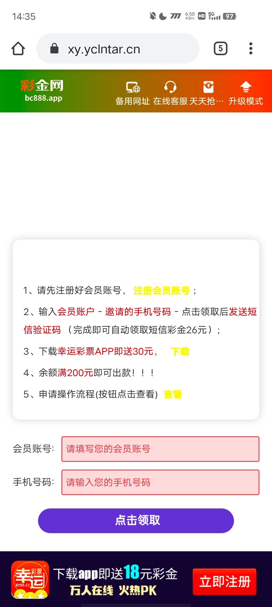 新用户进去网站随便输入一个账号 再输入自己手机号 是特邀的话再注册 特邀碰瓷都去试试 不是特邀可以去申请下载app30彩金 游戏和提款限制自行查看