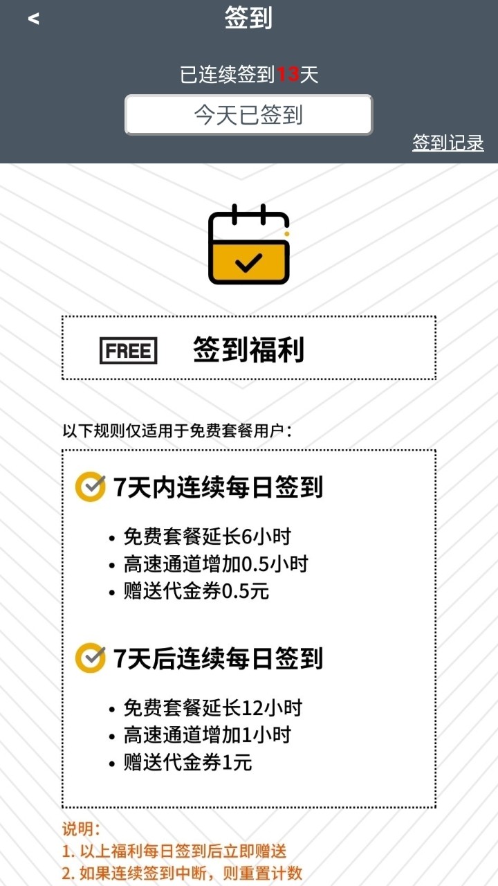 新用户刚注册可以免费获得30天每日签到可以获得免费时长+代金卷(积攒足够多了可以用来购买VIP)