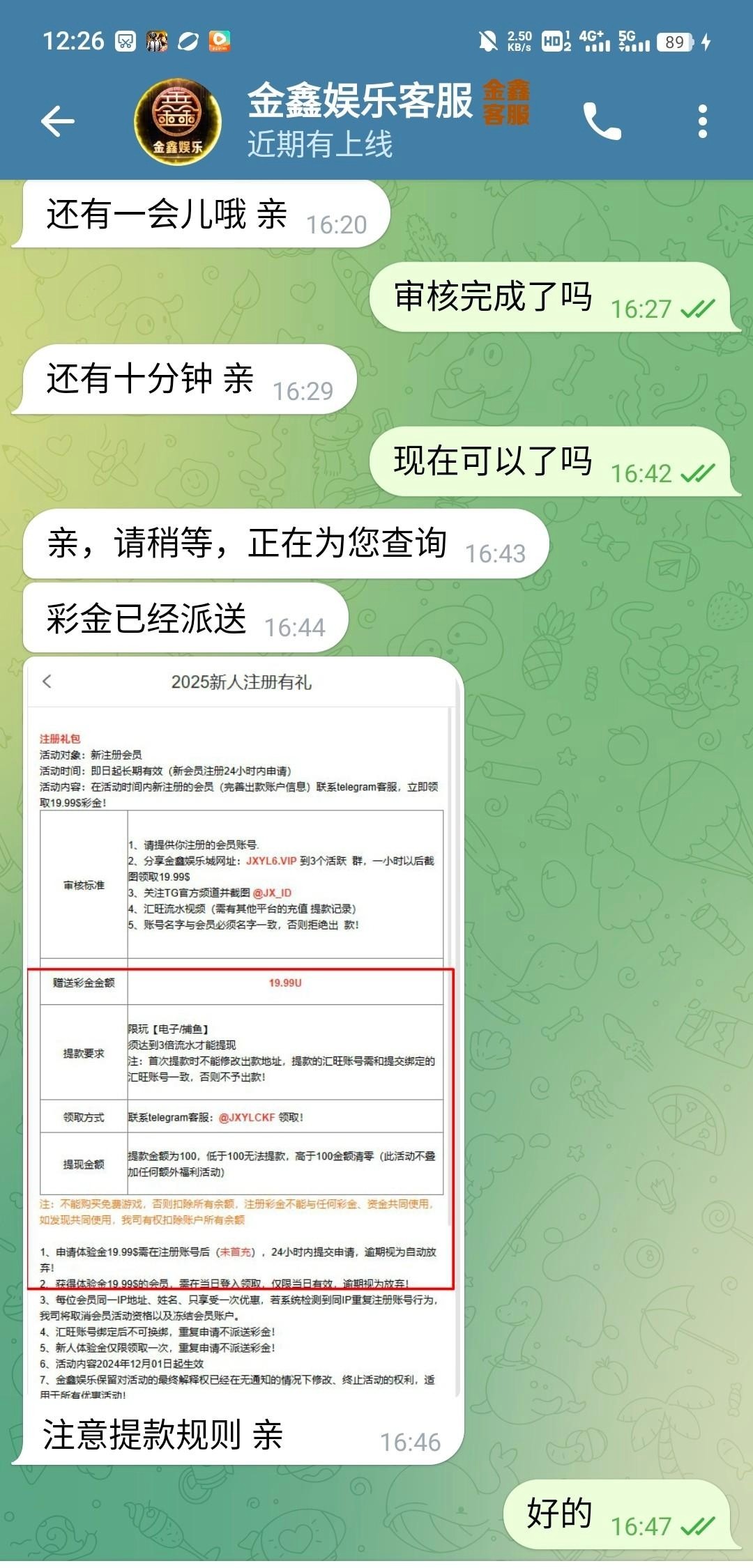 金鑫娱乐城联系飞机客服@JXYLCKF,按照客服要求注册,我欧意流水也给了,最高最低100u,我没打出来