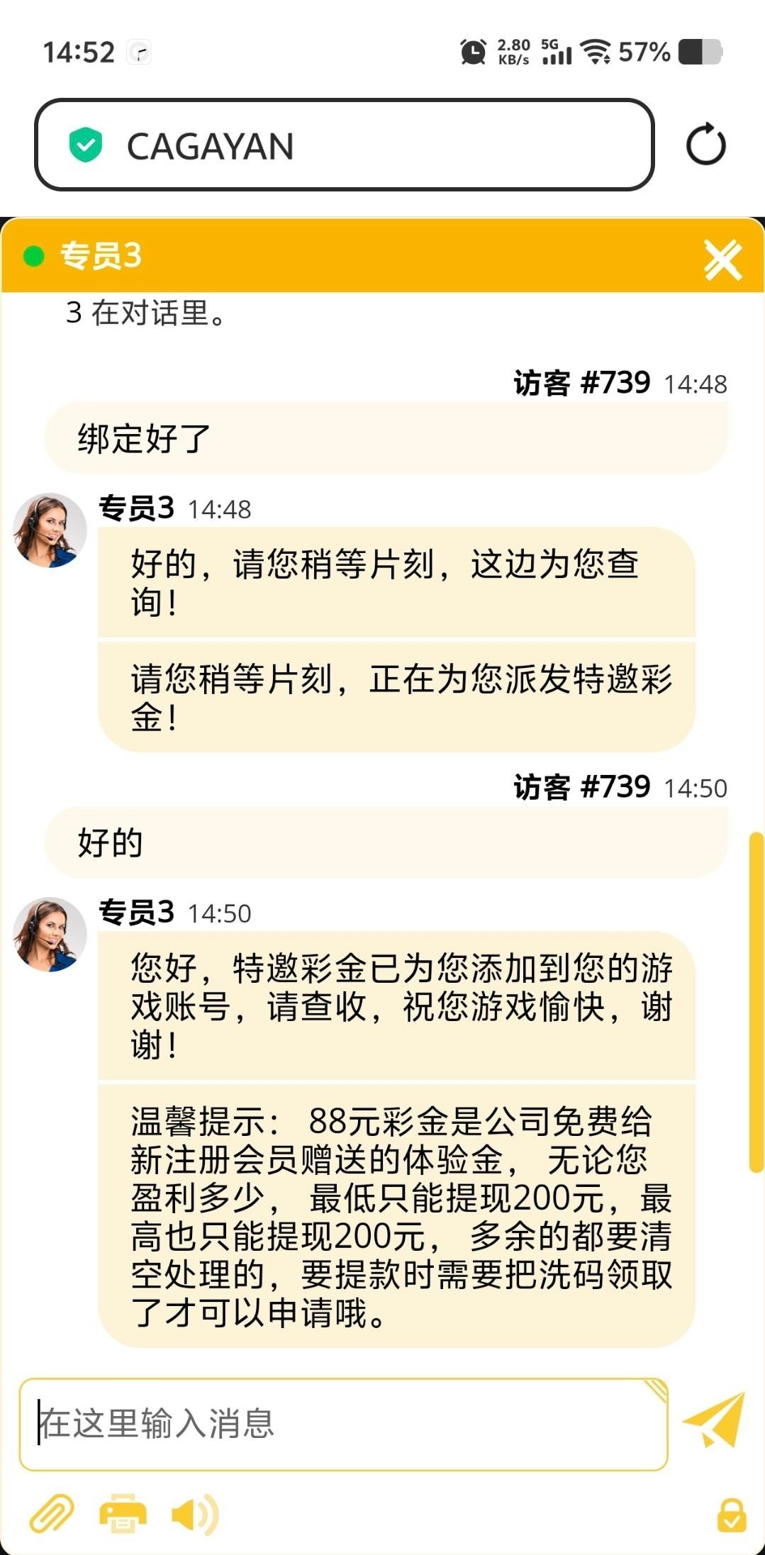 打电话来说注册联系客服申请,送了88