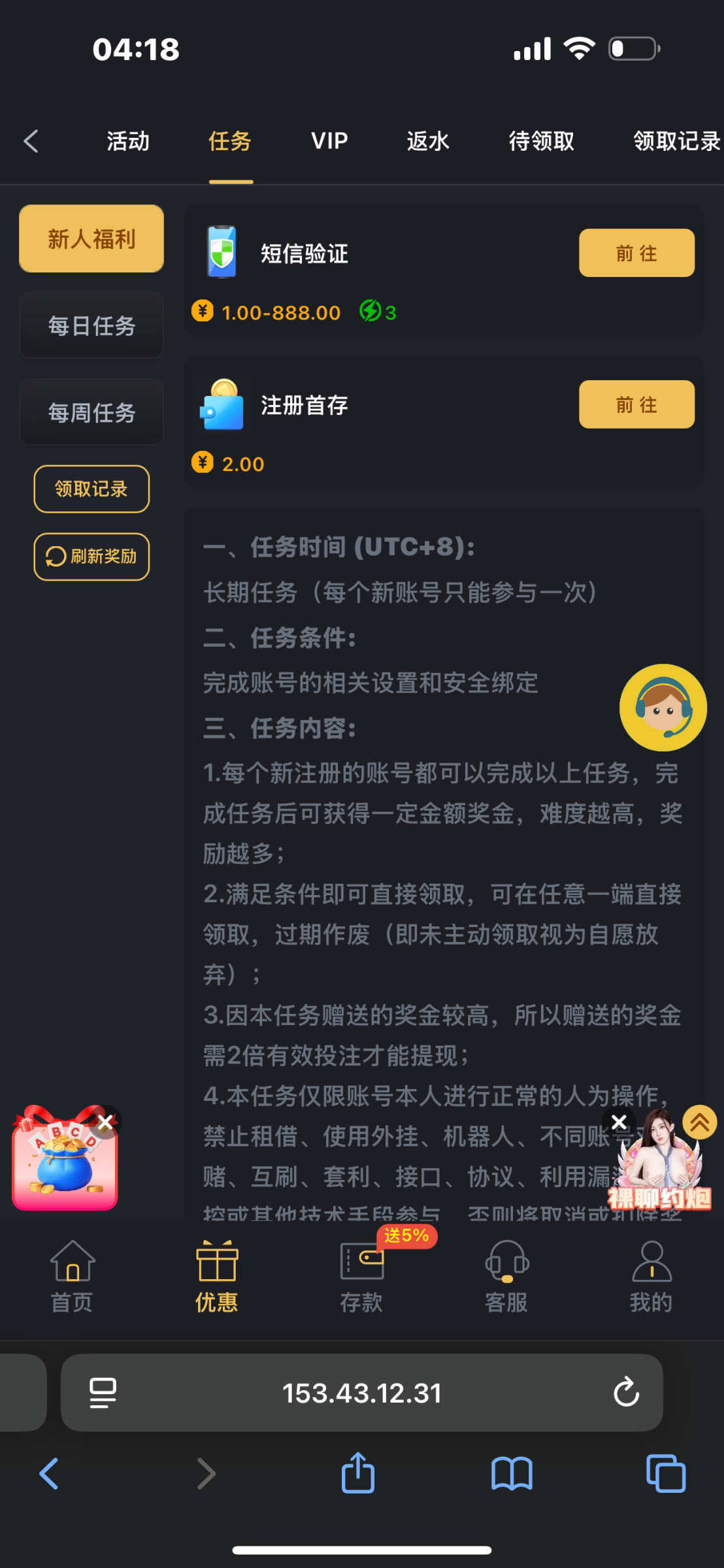 WNSR.vip 赌神项目 新用户注册送优惠-任务里短信验证