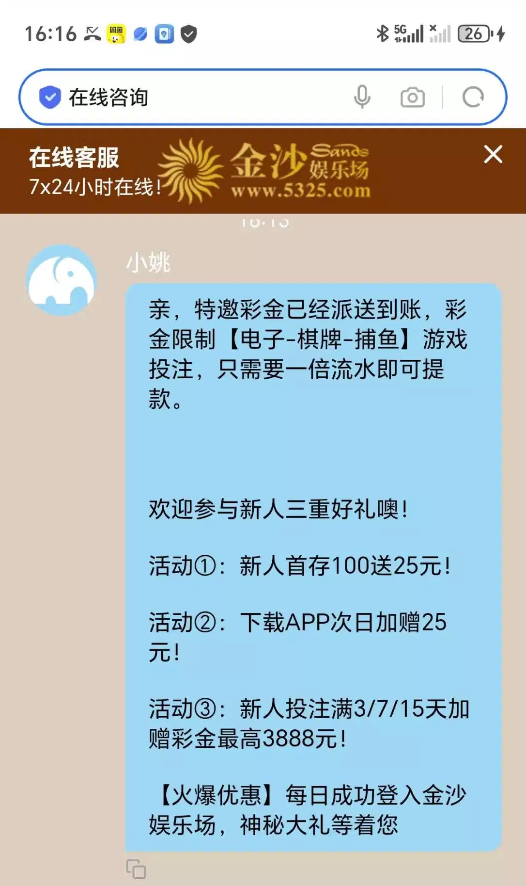链接5325.com 今天打电话过让我注册领取特邀彩金,登录平台我一看注册过了之前还领取过特邀彩金,我就紧接着看看能不能碰着没想到给了9块彩金