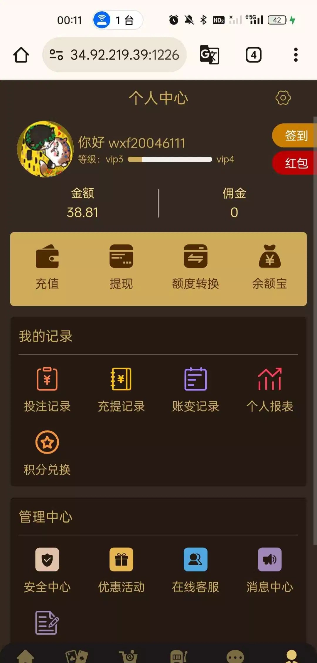 之前有过特邀活动的 看注册时间送彩金 我上个月注册的领了38 半黑台吧 我提现是没有什么问题 聊天室找管理领取