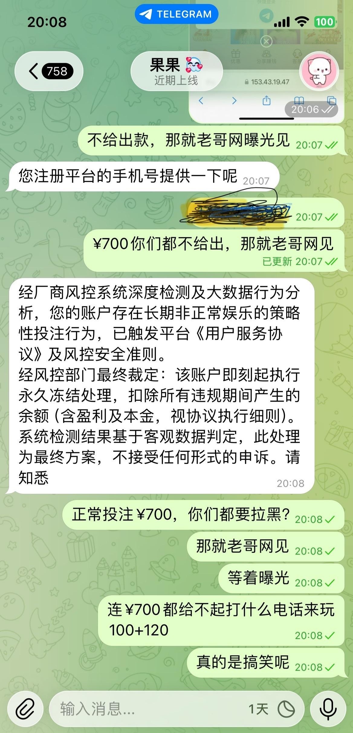 打电话来100+120,流水打够了正常投注,盈利了打到713提现,第一次提u拒绝,第二次提钱包账号异常