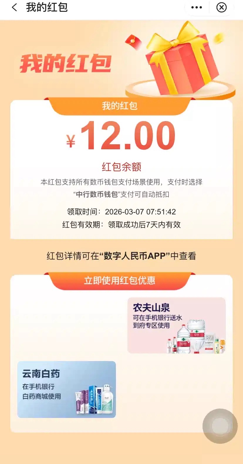 【中国银行数字钱包12立减金】 白菜
