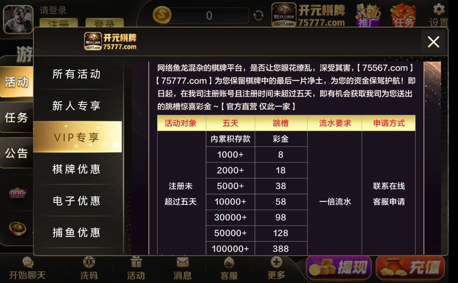 新人注册绑定银行卡,向客服提供别的平台账号,根据在别的平台充值额度赠送彩金,